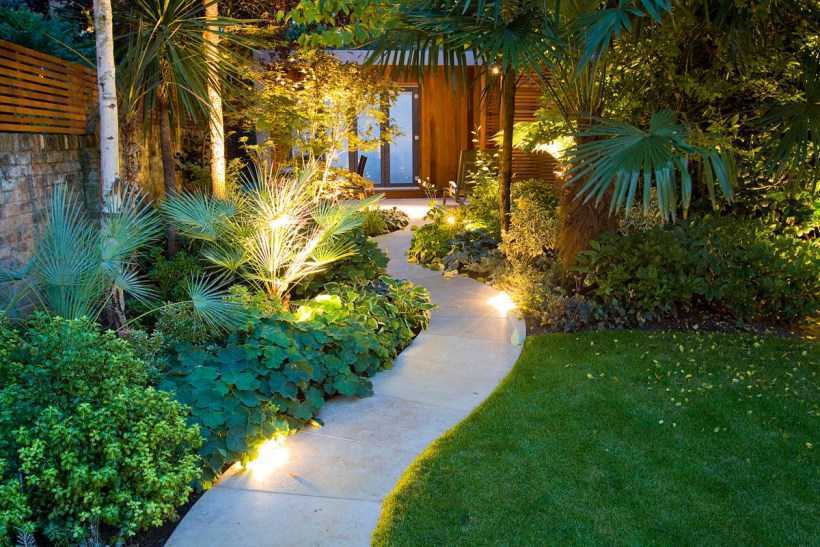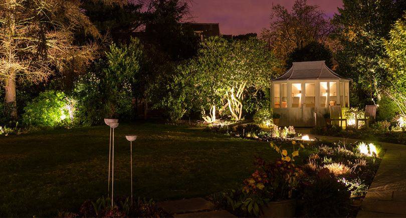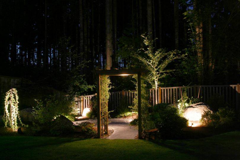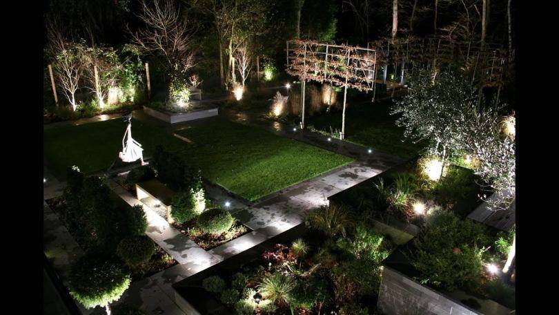 Освещение выполняется по контуру, подчёркивая границы сада с акцентом на отдельные его зоны. В основном это мягкий и рассеянный свет с точечным позиционированием декоративных мест.