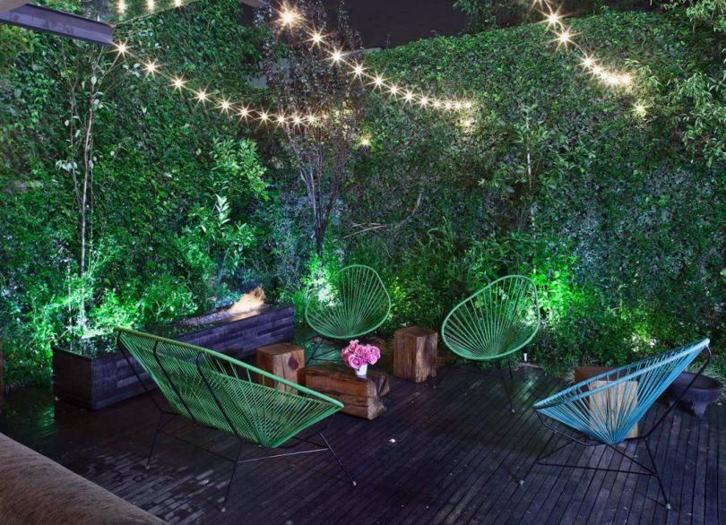 В зоне отдыха (в месте расположения беседки, гамака, качелей) рекомендуется использовать мягкий рассеянный свет, причём тёплых тонов. Добавить уюта этой зоне помогут светильники с имитацией живого огня.