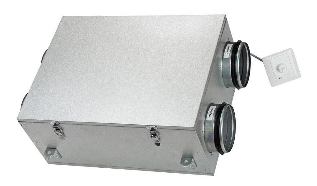 Установка принудительной вентиляции на вытяжку и приток с применением рекуператоров. Считается энергосберегающей. Пластинчатые приборы с теплообменником аккумулируют комнатное тепло или холод от кондиционеров (в летнее время) и отдают его воздуху с улицы. При подаче холодного воздуха принудительным путем кратность обмена воздуха возрастает. В результате не успевший отдать тепло нагретый поток сразу же выводится на улицу. В приточно-вытяжных установках с опцией рекуперации происходит теплообмен между холодным (приходящим) и теплым (отводимым) воздухом. При этом отдается только тепло, но не запахи и различные загрязнения.
