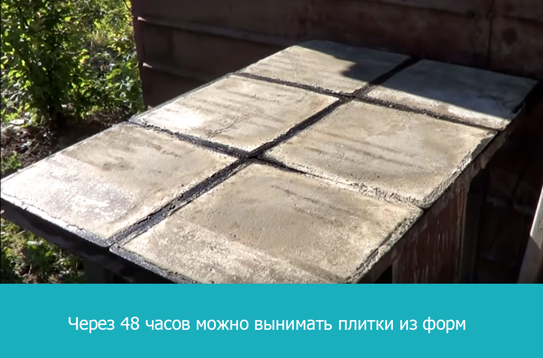 После разливки смеси в пресс-формы необходимо ее закрыть пленкой, которая не позволит испаряться влаге. Через трое суток с плитки снимают опалубку, а затем переносят изделия в место хранения. Запрещено преждевременно освобождать изделия, поскольку их форма из-за этого может нарушиться.