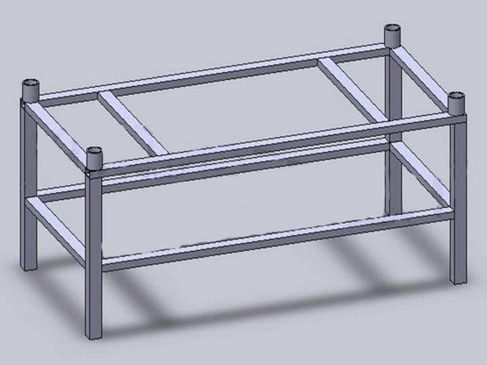 трубы для формирования верхних перекладин – 40х20 при толщине в 2 мм. (84 руб/м.п.) и нижних перекладин – 20х20 при толщине в 2 мм. (53 руб/м.п.). Если используется одинаковый размер заготовок, нужно брать более массивные, т.к. они должны выдерживать вес столешницы и размещенных на ней форм; Конструкция рамы вибростола для плиткиРама с опорами для вибростола