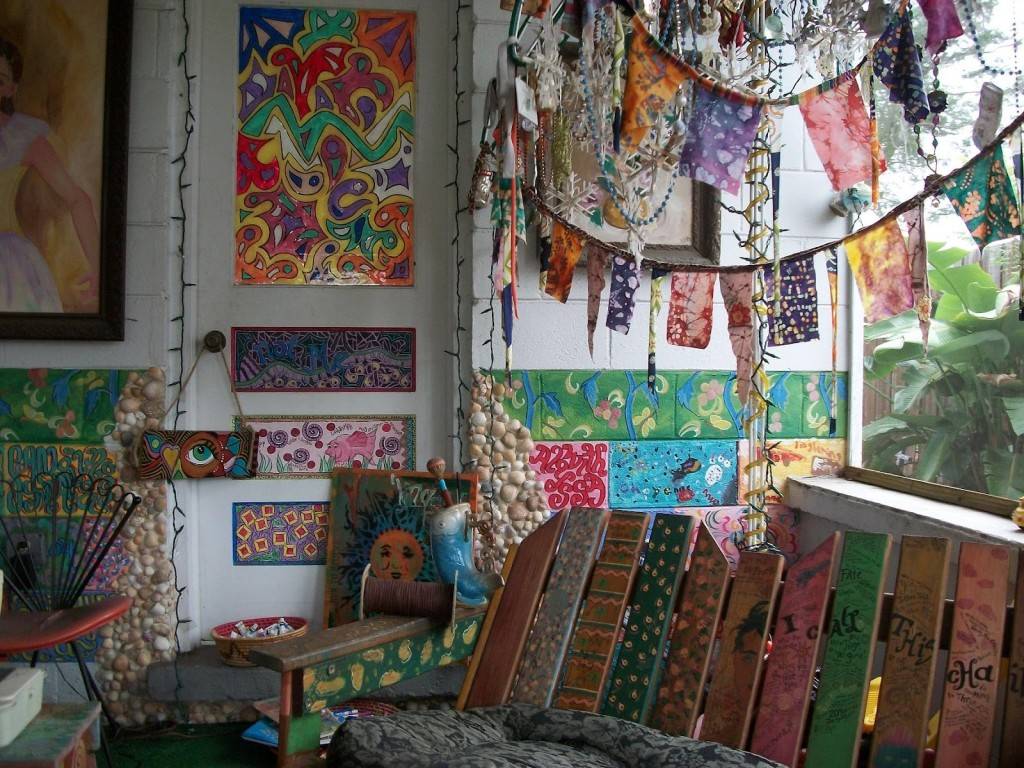Главное правило стиля хиппи – никаких правил. Лишь выражение вселенской свободы, любви, оптимизма. Яркие цвета часто оформлены в радугу, присутствует аляповатая мебель, коврики и изделия ручной работы.