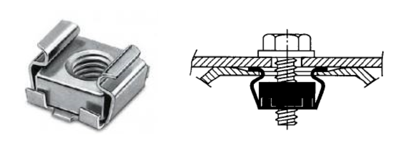 Гайка кузовная – скорее уже не деталь, а сборка. Она состоит из двух деталей: вкладыша и обоймы. Вкладыш – обычная квадратная гайка. Обойма изогнута особым образом из пружинной стали. Гайка используется при сборке кузовов автомобилей, организуя отверстия с резьбой в тонкой обшивке, направляющих электрических систем.