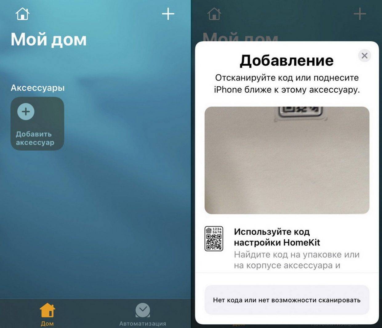 Для привязки необходимо направить камеру iPhone на QR-код в инструкции. После распознавания приложение предложит выбрать комнату (месторасположение) и установить имя аксессуара.