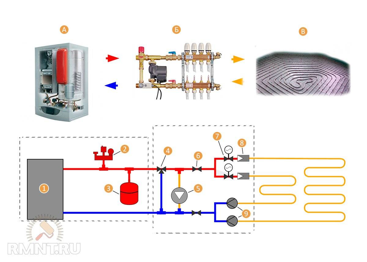 Схема отопления дома водяными тёплыми полами. А — газовый котёл отопления; Б — объединённый узел смешения и коллекторная группа; В — контур тёплого пола. 1 — котёл со встроенным циркуляционным насосом; 2 — группа безопасности; 3 — расширительный бак; 4 — трёхходовой клапан смешения; 5 — циркуляционный насос; 6 — шаровый вентиль; 7 — игольчатый вентиль или вентиль с сервоприводом; 8 — редуктор давления; 9 — расходомер