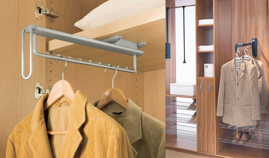 Пантографы. Относятся к дорогим и востребованным аксессуарам. Они удобны, так как позволяют доставать одежду из подпотолочной части конструкции. Это пружинный механизм с ручкой, благодаря которому штангу с одеждой можно плавно опускать и поднимать, не прилагая особых усилий. Для крепления используются боковые направляющие или задняя стенка. В элитных моделях присутствуют гидравлические механизмы, за счет которых управление бывает ступенчатым с корректировкой угла наклона штанги.