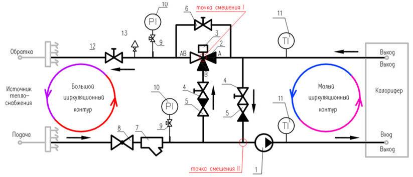 Если в схеме поменять перемычку и клапан местами, а циркуляцию воды во внутреннем контуре осуществлять через перемычку, то напор циркуляционного насоса в этом случае будет меньше на величину гидравлического сопротивления клапана. Расход теплоносителя со стороны теплосети останется постоянным, а клапан будет работать на свободном перепаде давления (схема №6).