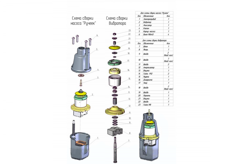 На этой схеме представлены составляющие компоненты насоса «Ручеек». В случае поломки устройство не сложно разобрать и отремонтировать