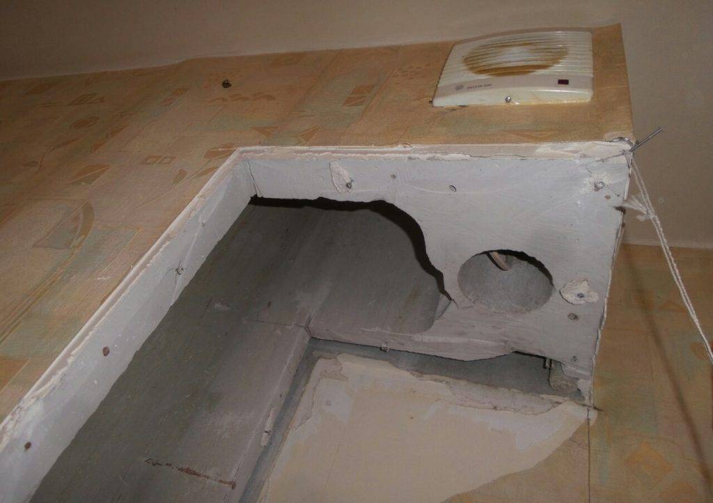 На следующем этапе нужно вскрыть часть пола и потолка, где ранее проходила вентиляционная шахта. Рассматривается самый сложный вариант, когда короб был полностью демонтирован.