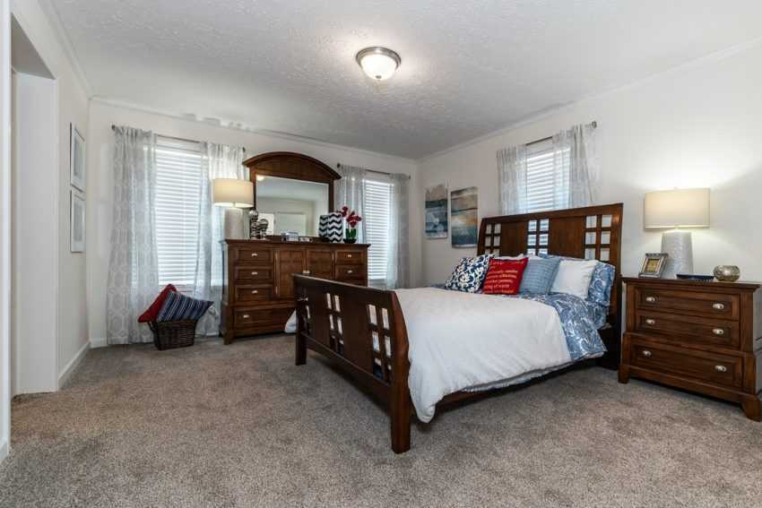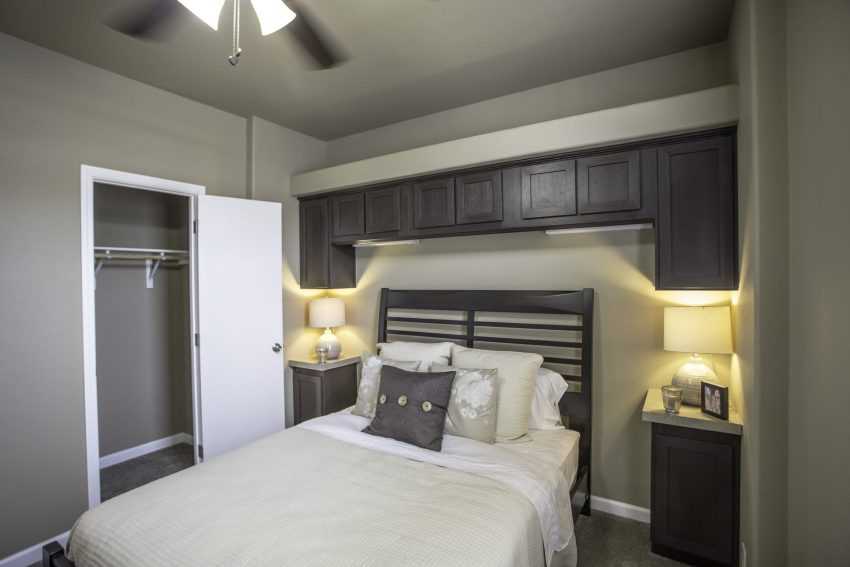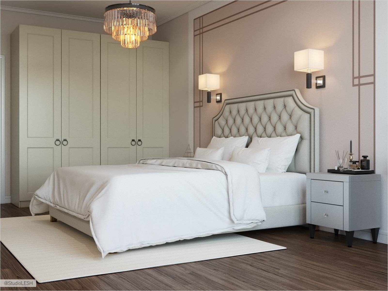 Меблируя спальную комнату, стоит отказаться от размещения предметов чётко по периметру, если не хотите, чтобы она была похожа на короб. Кровать рекомендуется установить изголовьем к стене, не имеющей проёмов, на расстоянии минимум в 70 см от трёх других стен. Предпочтительно, чтобы ложе занимало центральную часть помещения.
