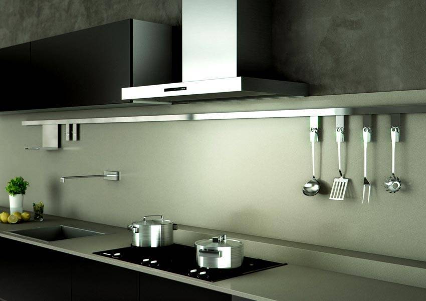 - Подвесные. Устанавливаются под шкафом или полкой над плитой.