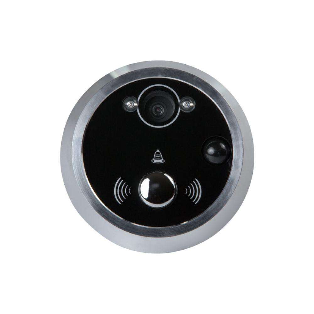 Одна из лучших модификаций для монтажа на тонкие металлические двери толщиной до 110 мм. Диаметр смотрового отверстия составляет 65 мм, поэтому девайс обладает отличной обзорностью. Четкость фото даже в темноте отличается приемлемым качеством благодаря функционированию подсветки-фонарика. Однако четкость видео остается относительно низкой. В видеоглазке предусмотрен слот для карточки объемом до 32 Гб, поэтому записанные файлы можно хранить достаточно долго. Чтобы выполнить установку, понадобится минимум знаний и усилий, поэтому заниматься подключением может даже не специалист. При этом модель выглядит вполне красиво и не бросается в глаза посторонним.