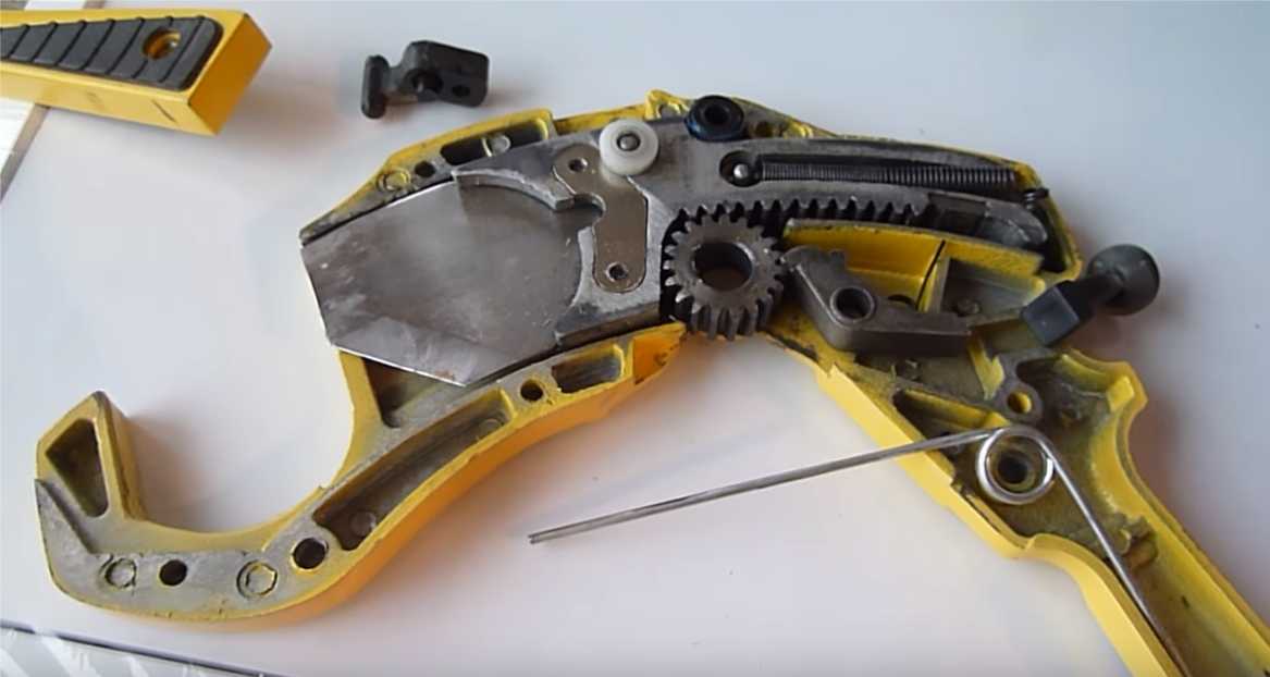 Пользоваться храповыми пистолетами немного удобнее, чем ножницами, они также рассчитаны на резку труб до 42 мм и имеют более высокую стоимость. В приспособлениях используются как стационарные, так и сменные ножи.