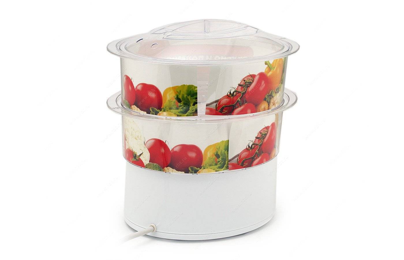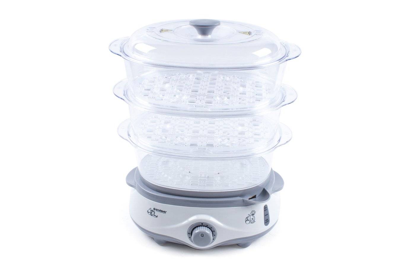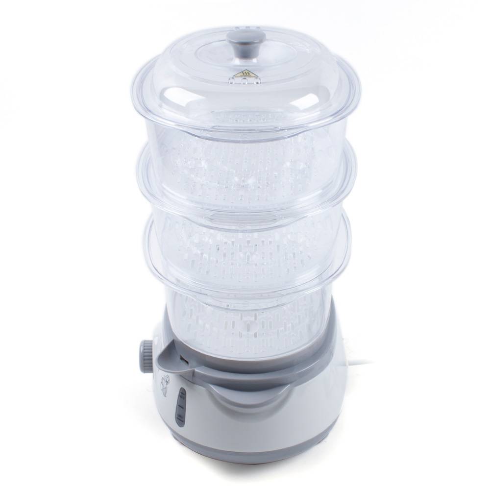 Здесь нет поворотного переключателя, вместо него акватаймер. Корпус пластиковый, постороннего запаха нет, на корпусе есть отметки уровней. Сетевой шнур можно отсоединить. 3 яруса, нижняя корзина – 3 литра, две верхние по 2 литра. Этого хватит для 2-3 человек. Допускается мытьё в посудомойке, что упрощает эксплуатацию. Дополнительно производитель в набор добавил ёмкость для готовки риса.