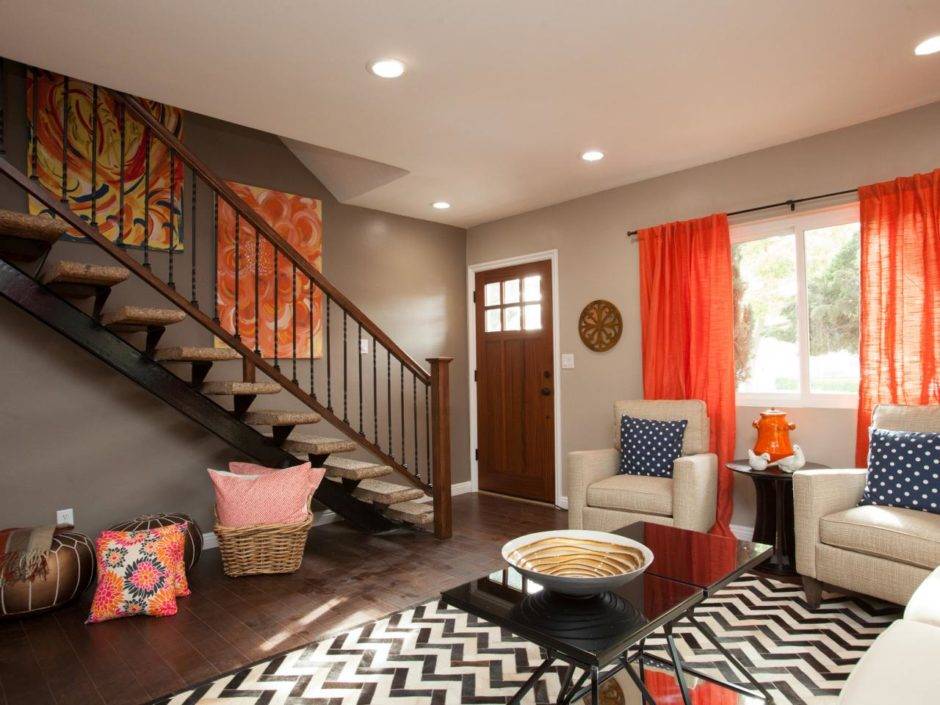 Оранжевые. Такие шторы, так же как и предыдущие, привнесут в обстановку жизнерадостные нотки и оживят серые обои в интерьере.