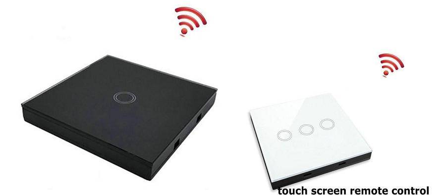 - Беспроводный сенсорный выключатель с управлением через пульт ДУ. Изделие крепится на стене, отличается небольшими габаритами и выполнено из закаленного стекла и ПВХ. Рабочее напряжение составляет от 110 до 220В, а номинальная мощность — до 300 Вт. В комплектацию входит выключатель, пульт ДУ и болты для крепления аксессуара. Средний цикл жизни составляет 1000 нажатий.