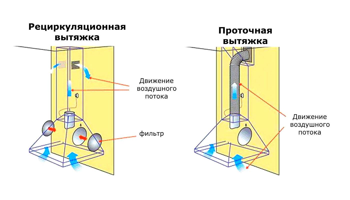 По способу очистки воздуха все вытяжки можно разделить на 2 вида – отводящие (втягивающие) и рециркуляционные. Вторые не связаны с вентиляционными каналами посредством труб и коробов, функционируют в автономном режиме