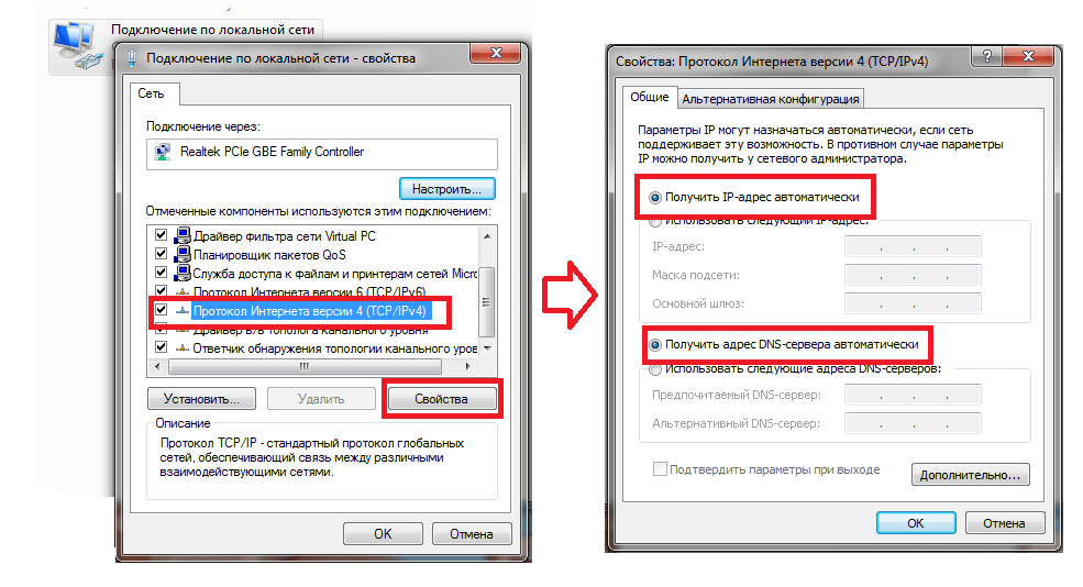 Откроется окно «Свойства», в списке ищем «Протоколы интернета версия 4 (TCP/IPv4)», выберем и жмем «Свойства».>>Далее ставим точки напротив «Получить ip адрес автоматически» и «Получение адреса DNS сервера автоматически».
