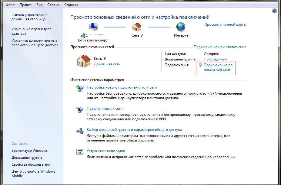 В нижнем правом углу (возле часов) будет значок сети в виде монитора, жмем на него и выбираем надпись «Центр управления сетями и общим доступом»
