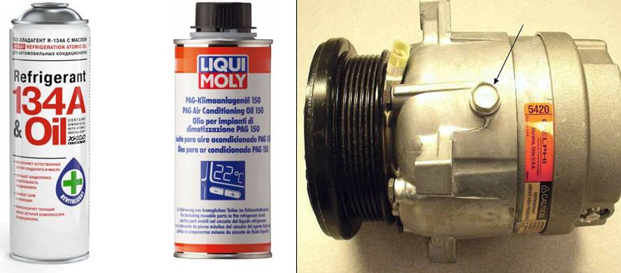 Ответ довольно прост — для заправки автомобильного кондиционера лучше использовать фреон с добавлением масла (такая информация указывается на баллончике с хладагентом), поскольку оно там уже дозировано. Но если, все же, предусмотрена отдельная заправка смазки, то следует использовать полиалкиленгликолевое масло – PAG (на фото по средине). Масло заливается в компрессор через картер (указано стрелкой на фото справа).