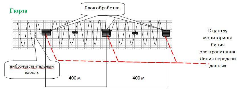 Эта система обнаруживает несанкционированное проникновение по вибрационному принципу. Для этого она оснащена трибоэлектрическим кабелем, который монтируется на заграждение. Причем на чувствительный элемент устанавливают оконечную деталь с одной стороны, а с другой он подключается к устройству обработки сигналов.