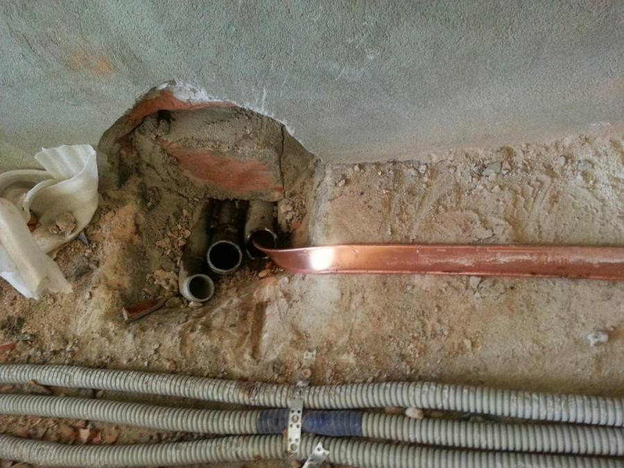 Уложив полосу и прикопав её, я занялся крепежом. Излишки шины были отпилены при помощи болгарки, на самом полотне просверлены 4 отверстия: 2 поменьше, для фиксации к стене, и 2 больших, предназначенных для соединения с проводом заземления, идущим на распределительный щит. В стене были также пробурены 2 отверстия, в которые я вставил пластиковые пробки дюбель-гвоздей. С их помощью шина была прочно зафиксирована.